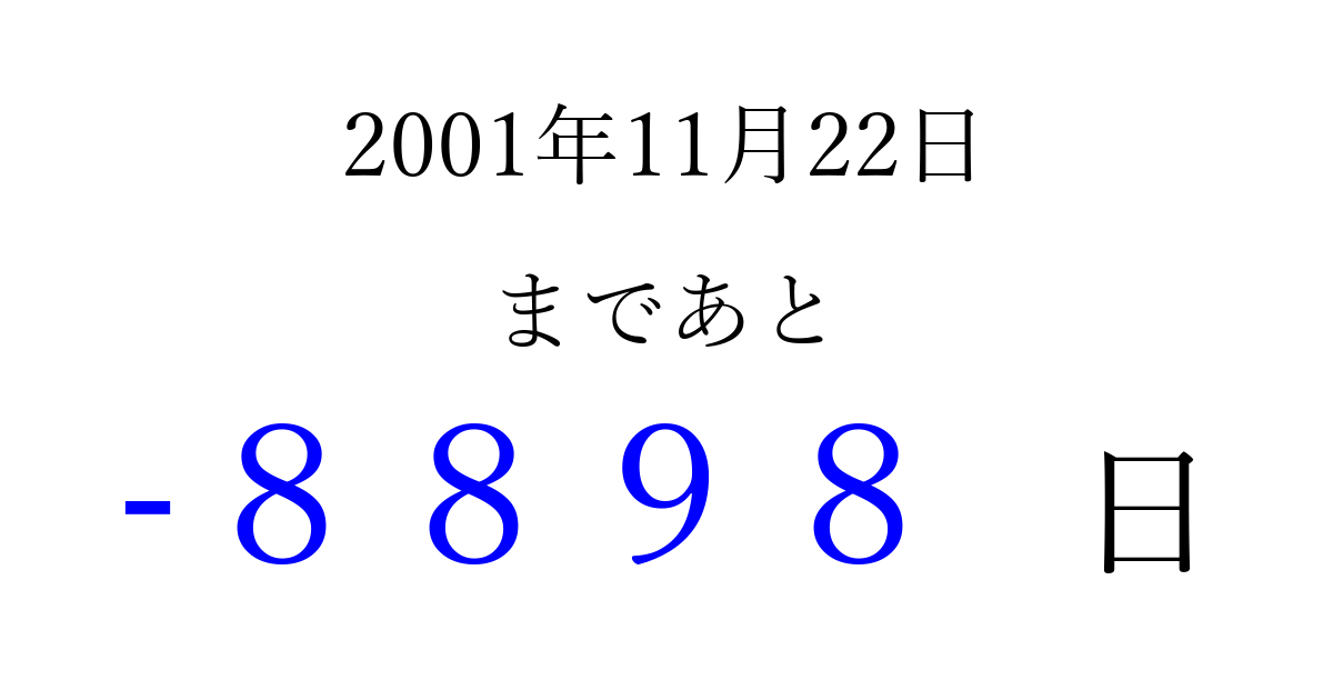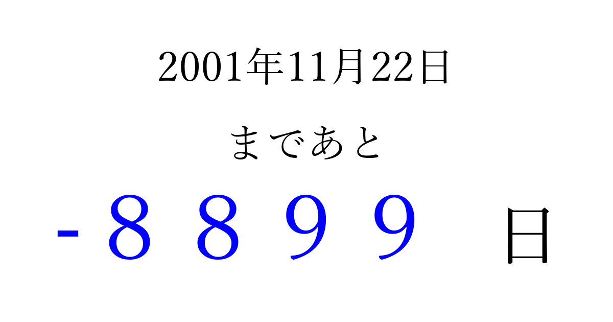 2001年11月22日(木)は もう 0000 日過ぎました 追加すると、トップページからすぐ選べるようになります ※2026/04/04現在の結果です。 最新の状態に更新する ↓シェアして、タイムライン上にカウントダウンを表示しよう!↓ 📤 この結果を共有する Tweet シェア Threads Bluesky 別の日付でカウントダウン 2001年11月のカレンダー このページをブックマークに追加すると、いつでもカウントダウンを確認できます。 (PC: Ctrl+D / Mac: ⌘+D) hitome-notes.comでは以下のページも運営しています。 指定日と期間から日付を計算 | ガチャ確率計算・シミュレーション | プライバシー・ポリシー 運営者:Avocado