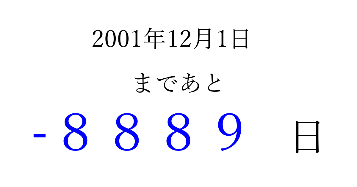2001年12月1日(土)は もう 0000 日過ぎました 追加すると、トップページからすぐ選べるようになります ※2026/04/03現在の結果です。 最新の状態に更新する ↓シェアして、タイムライン上にカウントダウンを表示しよう!↓ 📤 この結果を共有する Tweet シェア Threads Bluesky 別の日付でカウントダウン 2001年12月のカレンダー このページをブックマークに追加すると、いつでもカウントダウンを確認できます。 (PC: Ctrl+D / Mac: ⌘+D) hitome-notes.comでは以下のページも運営しています。 指定日と期間から日付を計算 | ガチャ確率計算・シミュレーション | プライバシー・ポリシー 運営者:Avocado