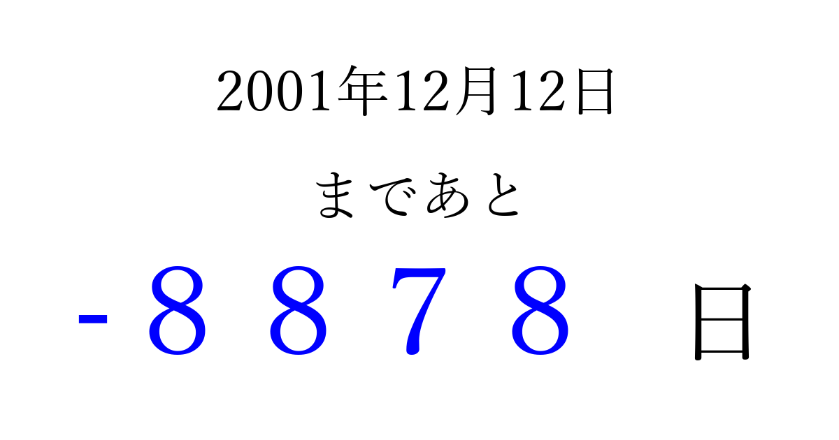 2001年12月12日(水)は もう 0000 日過ぎました 追加すると、トップページからすぐ選べるようになります ※2026/04/03現在の結果です。 最新の状態に更新する ↓シェアして、タイムライン上にカウントダウンを表示しよう!↓ 📤 この結果を共有する Tweet シェア Threads Bluesky 別の日付でカウントダウン 2001年12月のカレンダー このページをブックマークに追加すると、いつでもカウントダウンを確認できます。 (PC: Ctrl+D / Mac: ⌘+D) hitome-notes.comでは以下のページも運営しています。 指定日と期間から日付を計算 | ガチャ確率計算・シミュレーション | プライバシー・ポリシー 運営者:Avocado