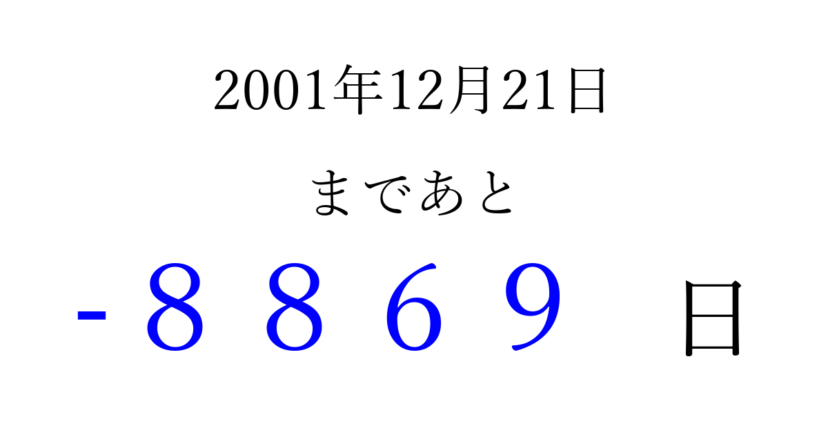 2001年12月21日(金)は もう 0000 日過ぎました 追加すると、トップページからすぐ選べるようになります ※2026/04/03現在の結果です。 最新の状態に更新する ↓シェアして、タイムライン上にカウントダウンを表示しよう!↓ 📤 この結果を共有する Tweet シェア Threads Bluesky 別の日付でカウントダウン 2001年12月のカレンダー このページをブックマークに追加すると、いつでもカウントダウンを確認できます。 (PC: Ctrl+D / Mac: ⌘+D) hitome-notes.comでは以下のページも運営しています。 指定日と期間から日付を計算 | ガチャ確率計算・シミュレーション | プライバシー・ポリシー 運営者:Avocado