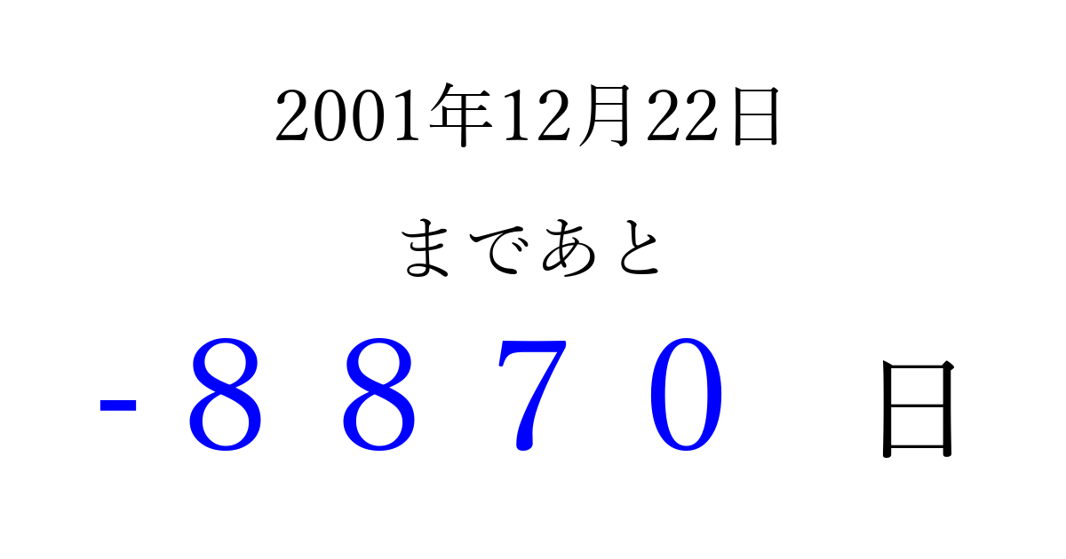 2001年12月22日(土)は もう 0000 日過ぎました 追加すると、トップページからすぐ選べるようになります ※2026/04/05現在の結果です。 最新の状態に更新する ↓シェアして、タイムライン上にカウントダウンを表示しよう!↓ 📤 この結果を共有する Tweet シェア Threads Bluesky 別の日付でカウントダウン 2001年12月のカレンダー このページをブックマークに追加すると、いつでもカウントダウンを確認できます。 (PC: Ctrl+D / Mac: ⌘+D) hitome-notes.comでは以下のページも運営しています。 指定日と期間から日付を計算 | ガチャ確率計算・シミュレーション | プライバシー・ポリシー 運営者:Avocado