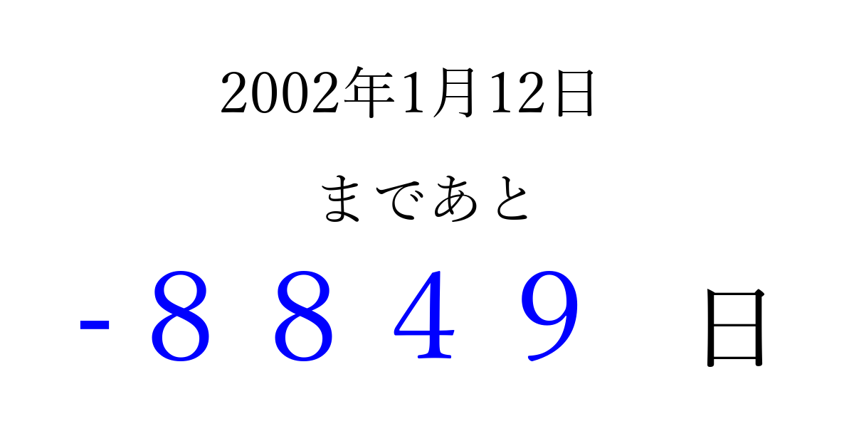 2002年1月12日(土)は もう 0000 日過ぎました 追加すると、トップページからすぐ選べるようになります ※2026/04/05現在の結果です。 最新の状態に更新する ↓シェアして、タイムライン上にカウントダウンを表示しよう!↓ 📤 この結果を共有する Tweet シェア Threads Bluesky 別の日付でカウントダウン 2002年1月のカレンダー このページをブックマークに追加すると、いつでもカウントダウンを確認できます。 (PC: Ctrl+D / Mac: ⌘+D) hitome-notes.comでは以下のページも運営しています。 指定日と期間から日付を計算 | ガチャ確率計算・シミュレーション | プライバシー・ポリシー 運営者:Avocado