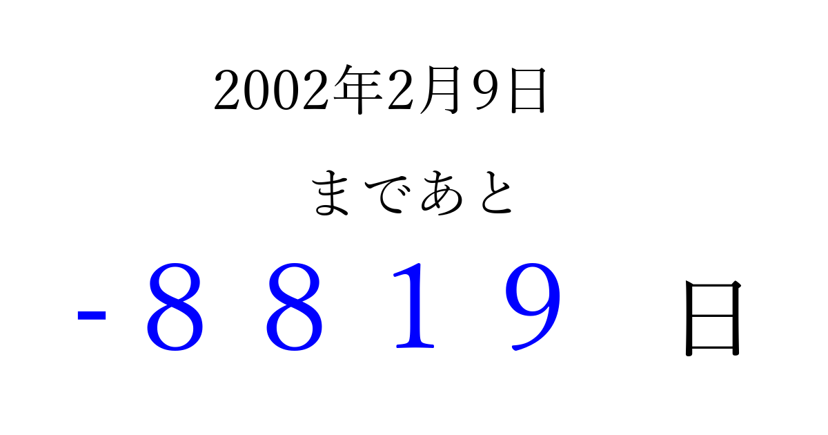 2002年2月9日(土)は もう 0000 日過ぎました 追加すると、トップページからすぐ選べるようになります ※2026/04/03現在の結果です。 最新の状態に更新する ↓シェアして、タイムライン上にカウントダウンを表示しよう!↓ 📤 この結果を共有する Tweet シェア Threads Bluesky 別の日付でカウントダウン 2002年2月のカレンダー このページをブックマークに追加すると、いつでもカウントダウンを確認できます。 (PC: Ctrl+D / Mac: ⌘+D) hitome-notes.comでは以下のページも運営しています。 指定日と期間から日付を計算 | ガチャ確率計算・シミュレーション | プライバシー・ポリシー 運営者:Avocado