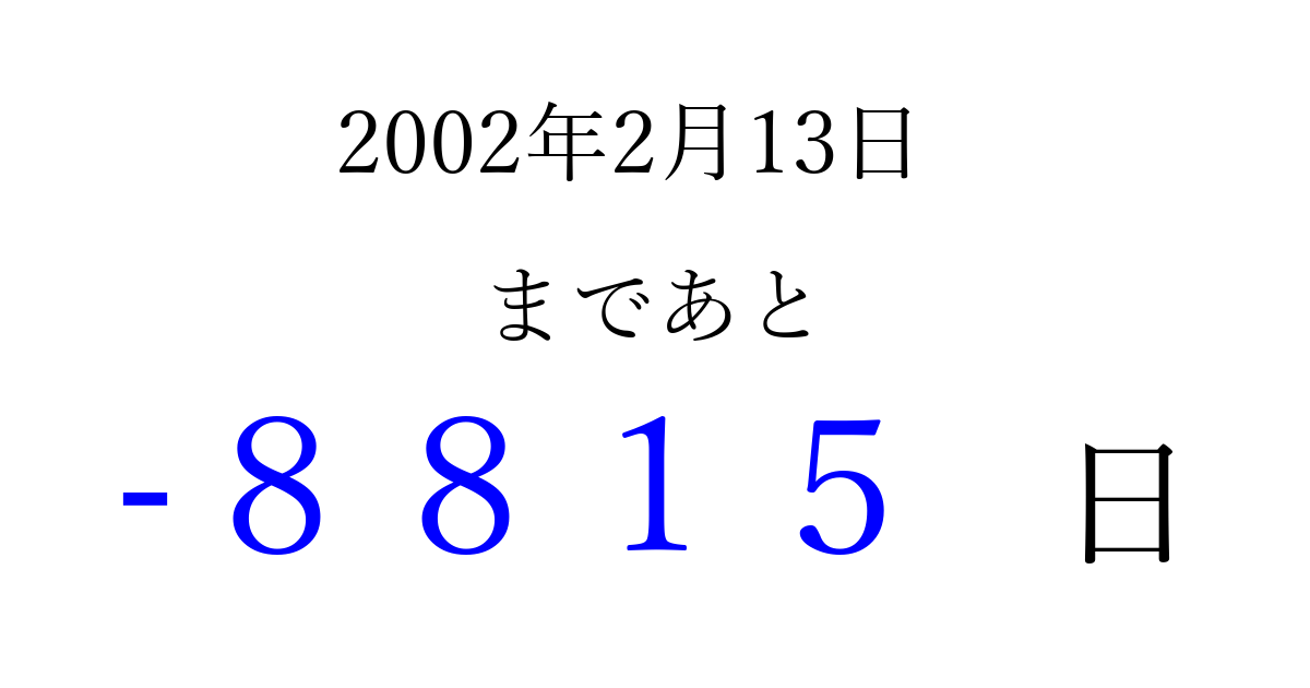 2002年2月13日(水)は もう 0000 日過ぎました 追加すると、トップページからすぐ選べるようになります ※2026/04/03現在の結果です。 最新の状態に更新する ↓シェアして、タイムライン上にカウントダウンを表示しよう!↓ 📤 この結果を共有する Tweet シェア Threads Bluesky 別の日付でカウントダウン 2002年2月のカレンダー このページをブックマークに追加すると、いつでもカウントダウンを確認できます。 (PC: Ctrl+D / Mac: ⌘+D) hitome-notes.comでは以下のページも運営しています。 指定日と期間から日付を計算 | ガチャ確率計算・シミュレーション | プライバシー・ポリシー 運営者:Avocado
