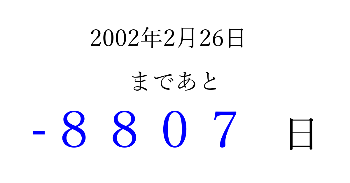 2002年2月26日(火)は もう 0000 日過ぎました 追加すると、トップページからすぐ選べるようになります ※2026/04/08現在の結果です。 最新の状態に更新する ↓シェアして、タイムライン上にカウントダウンを表示しよう!↓ 📤 この結果を共有する Tweet シェア Threads Bluesky 別の日付でカウントダウン 2002年2月のカレンダー このページをブックマークに追加すると、いつでもカウントダウンを確認できます。 (PC: Ctrl+D / Mac: ⌘+D) hitome-notes.comでは以下のページも運営しています。 指定日と期間から日付を計算 | ガチャ確率計算・シミュレーション | プライバシー・ポリシー 運営者:Avocado