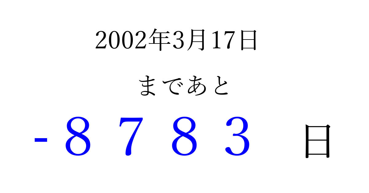 2002年3月17日(日)は もう 0000 日過ぎました 追加すると、トップページからすぐ選べるようになります ※2026/04/03現在の結果です。 最新の状態に更新する ↓シェアして、タイムライン上にカウントダウンを表示しよう!↓ 📤 この結果を共有する Tweet シェア Threads Bluesky 別の日付でカウントダウン 2002年3月のカレンダー このページをブックマークに追加すると、いつでもカウントダウンを確認できます。 (PC: Ctrl+D / Mac: ⌘+D) hitome-notes.comでは以下のページも運営しています。 指定日と期間から日付を計算 | ガチャ確率計算・シミュレーション | プライバシー・ポリシー 運営者:Avocado