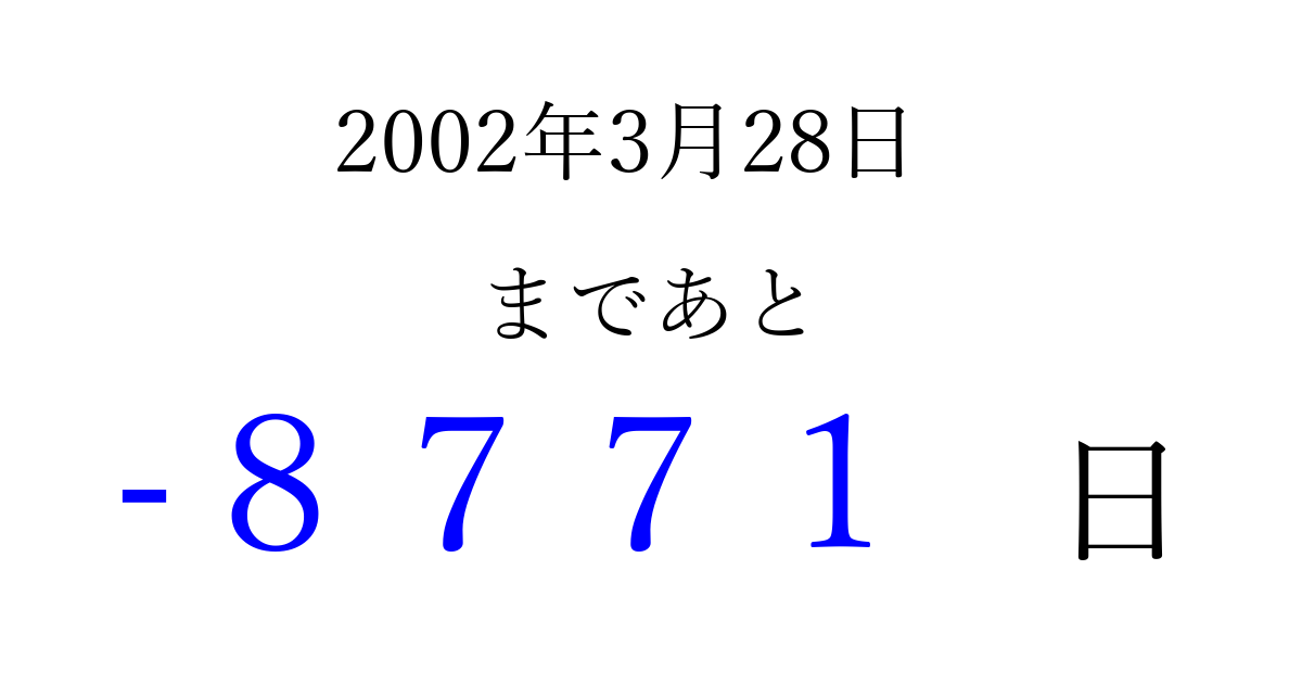 2002年3月28日(木)は もう 0000 日過ぎました 追加すると、トップページからすぐ選べるようになります ※2026/04/02現在の結果です。 最新の状態に更新する ↓シェアして、タイムライン上にカウントダウンを表示しよう!↓ 📤 この結果を共有する Tweet シェア Threads Bluesky 別の日付でカウントダウン 2002年3月のカレンダー このページをブックマークに追加すると、いつでもカウントダウンを確認できます。 (PC: Ctrl+D / Mac: ⌘+D) hitome-notes.comでは以下のページも運営しています。 指定日と期間から日付を計算 | ガチャ確率計算・シミュレーション | プライバシー・ポリシー 運営者:Avocado