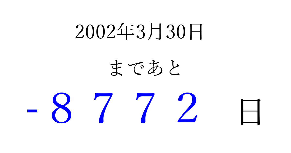 2002年3月30日(土)は もう 0000 日過ぎました 追加すると、トップページからすぐ選べるようになります ※2026/04/05現在の結果です。 最新の状態に更新する ↓シェアして、タイムライン上にカウントダウンを表示しよう!↓ 📤 この結果を共有する Tweet シェア Threads Bluesky 別の日付でカウントダウン 2002年3月のカレンダー このページをブックマークに追加すると、いつでもカウントダウンを確認できます。 (PC: Ctrl+D / Mac: ⌘+D) hitome-notes.comでは以下のページも運営しています。 指定日と期間から日付を計算 | ガチャ確率計算・シミュレーション | プライバシー・ポリシー 運営者:Avocado