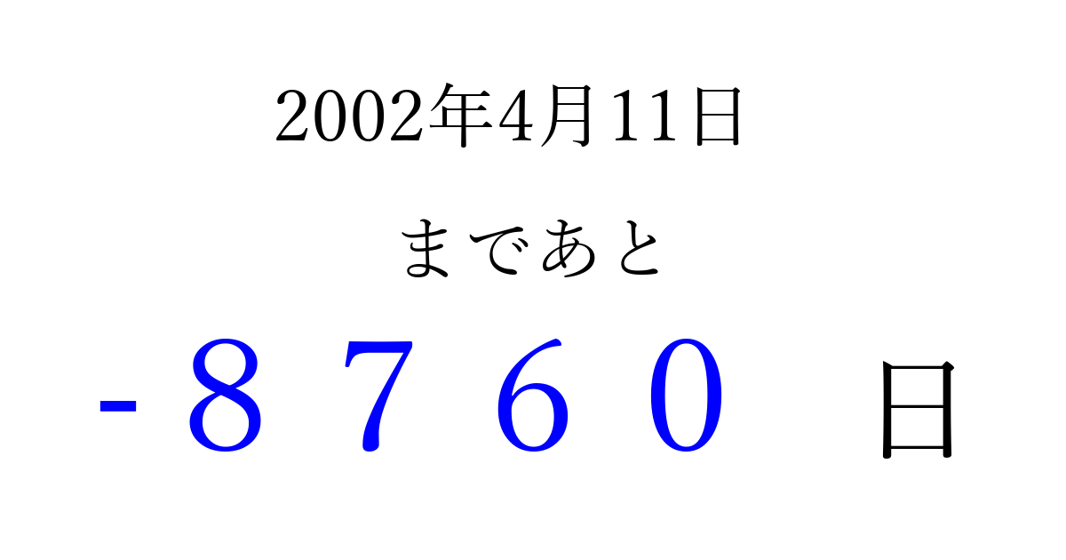 2002年4月11日(木)は もう 0000 日過ぎました 追加すると、トップページからすぐ選べるようになります ※2026/04/05現在の結果です。 最新の状態に更新する ↓シェアして、タイムライン上にカウントダウンを表示しよう!↓ 📤 この結果を共有する Tweet シェア Threads Bluesky 別の日付でカウントダウン 2002年4月のカレンダー このページをブックマークに追加すると、いつでもカウントダウンを確認できます。 (PC: Ctrl+D / Mac: ⌘+D) hitome-notes.comでは以下のページも運営しています。 指定日と期間から日付を計算 | ガチャ確率計算・シミュレーション | プライバシー・ポリシー 運営者:Avocado