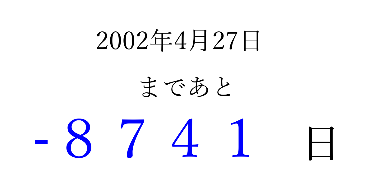 2002年4月27日(土)は もう 0000 日過ぎました 追加すると、トップページからすぐ選べるようになります ※2026/04/02現在の結果です。 最新の状態に更新する ↓シェアして、タイムライン上にカウントダウンを表示しよう!↓ 📤 この結果を共有する Tweet シェア Threads Bluesky 別の日付でカウントダウン 2002年4月のカレンダー このページをブックマークに追加すると、いつでもカウントダウンを確認できます。 (PC: Ctrl+D / Mac: ⌘+D) hitome-notes.comでは以下のページも運営しています。 指定日と期間から日付を計算 | ガチャ確率計算・シミュレーション | プライバシー・ポリシー 運営者:Avocado