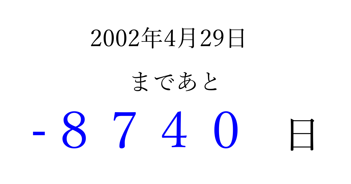 2002年4月29日(月)は もう 0000 日過ぎました 追加すると、トップページからすぐ選べるようになります ※2026/04/03現在の結果です。 最新の状態に更新する ↓シェアして、タイムライン上にカウントダウンを表示しよう!↓ 📤 この結果を共有する Tweet シェア Threads Bluesky 別の日付でカウントダウン 2002年4月のカレンダー このページをブックマークに追加すると、いつでもカウントダウンを確認できます。 (PC: Ctrl+D / Mac: ⌘+D) hitome-notes.comでは以下のページも運営しています。 指定日と期間から日付を計算 | ガチャ確率計算・シミュレーション | プライバシー・ポリシー 運営者:Avocado