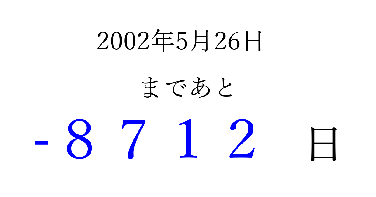 2002年5月26日(日)は もう 0000 日過ぎました 追加すると、トップページからすぐ選べるようになります ※2026/04/02現在の結果です。 最新の状態に更新する ↓シェアして、タイムライン上にカウントダウンを表示しよう!↓ 📤 この結果を共有する Tweet シェア Threads Bluesky 別の日付でカウントダウン 2002年5月のカレンダー このページをブックマークに追加すると、いつでもカウントダウンを確認できます。 (PC: Ctrl+D / Mac: ⌘+D) hitome-notes.comでは以下のページも運営しています。 指定日と期間から日付を計算 | ガチャ確率計算・シミュレーション | プライバシー・ポリシー 運営者:Avocado