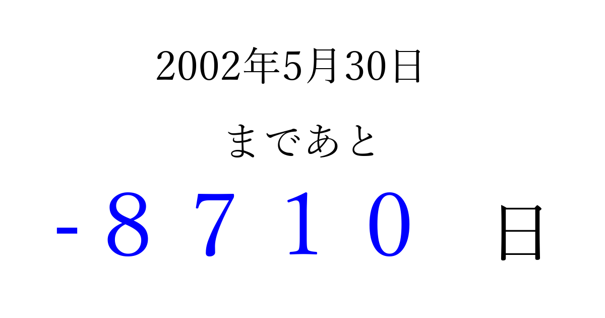 2002年5月30日(木)は もう 0000 日過ぎました 追加すると、トップページからすぐ選べるようになります ※2026/04/04現在の結果です。 最新の状態に更新する ↓シェアして、タイムライン上にカウントダウンを表示しよう!↓ 📤 この結果を共有する Tweet シェア Threads Bluesky 別の日付でカウントダウン 2002年5月のカレンダー このページをブックマークに追加すると、いつでもカウントダウンを確認できます。 (PC: Ctrl+D / Mac: ⌘+D) hitome-notes.comでは以下のページも運営しています。 指定日と期間から日付を計算 | ガチャ確率計算・シミュレーション | プライバシー・ポリシー 運営者:Avocado