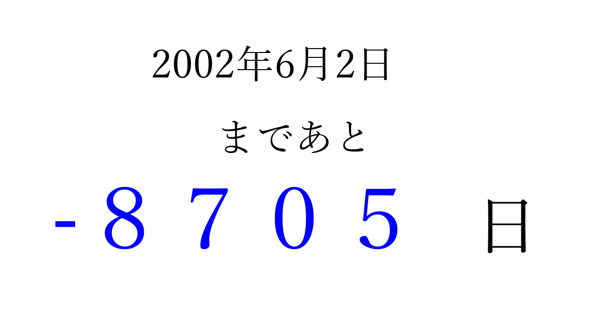 2002年6月2日(日)は もう 0000 日過ぎました 追加すると、トップページからすぐ選べるようになります ※2026/04/02現在の結果です。 最新の状態に更新する ↓シェアして、タイムライン上にカウントダウンを表示しよう!↓ 📤 この結果を共有する Tweet シェア Threads Bluesky 別の日付でカウントダウン 2002年6月のカレンダー このページをブックマークに追加すると、いつでもカウントダウンを確認できます。 (PC: Ctrl+D / Mac: ⌘+D) hitome-notes.comでは以下のページも運営しています。 指定日と期間から日付を計算 | ガチャ確率計算・シミュレーション | プライバシー・ポリシー 運営者:Avocado