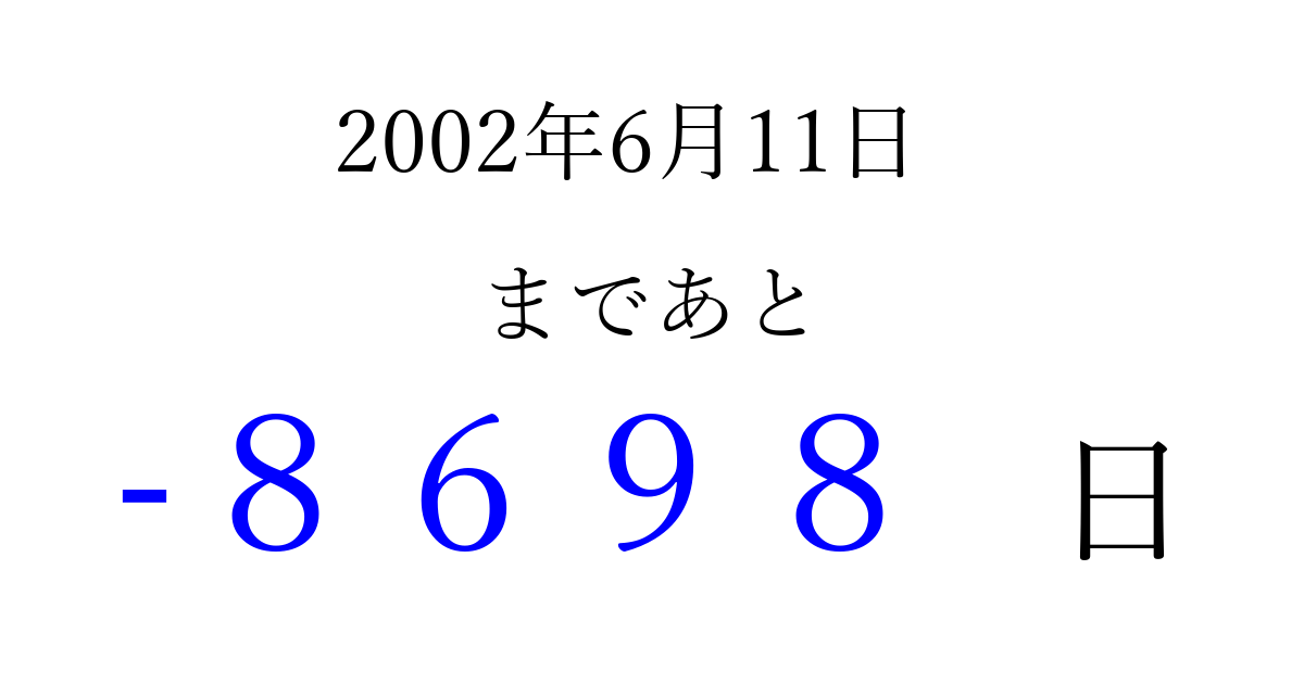 2002年6月11日(火)は もう 0000 日過ぎました 追加すると、トップページからすぐ選べるようになります ※2026/04/04現在の結果です。 最新の状態に更新する ↓シェアして、タイムライン上にカウントダウンを表示しよう!↓ 📤 この結果を共有する Tweet シェア Threads Bluesky 別の日付でカウントダウン 2002年6月のカレンダー このページをブックマークに追加すると、いつでもカウントダウンを確認できます。 (PC: Ctrl+D / Mac: ⌘+D) hitome-notes.comでは以下のページも運営しています。 指定日と期間から日付を計算 | ガチャ確率計算・シミュレーション | プライバシー・ポリシー 運営者:Avocado
