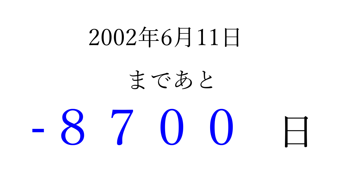 2002年6月11日(火)は もう 0000 日過ぎました 追加すると、トップページからすぐ選べるようになります ※2026/04/06現在の結果です。 最新の状態に更新する ↓シェアして、タイムライン上にカウントダウンを表示しよう!↓ 📤 この結果を共有する Tweet シェア Threads Bluesky 別の日付でカウントダウン 2002年6月のカレンダー このページをブックマークに追加すると、いつでもカウントダウンを確認できます。 (PC: Ctrl+D / Mac: ⌘+D) hitome-notes.comでは以下のページも運営しています。 指定日と期間から日付を計算 | ガチャ確率計算・シミュレーション | プライバシー・ポリシー 運営者:Avocado