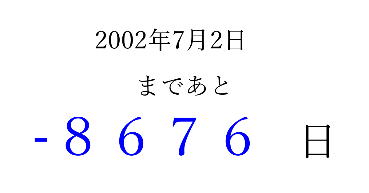 2002年7月2日(火)は もう 0000 日過ぎました 追加すると、トップページからすぐ選べるようになります ※2026/04/03現在の結果です。 最新の状態に更新する ↓シェアして、タイムライン上にカウントダウンを表示しよう!↓ 📤 この結果を共有する Tweet シェア Threads Bluesky 別の日付でカウントダウン 2002年7月のカレンダー このページをブックマークに追加すると、いつでもカウントダウンを確認できます。 (PC: Ctrl+D / Mac: ⌘+D) hitome-notes.comでは以下のページも運営しています。 指定日と期間から日付を計算 | ガチャ確率計算・シミュレーション | プライバシー・ポリシー 運営者:Avocado
