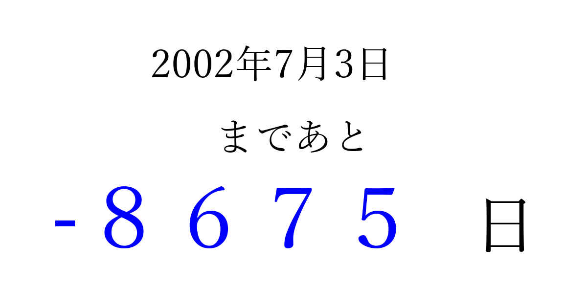 2002年7月3日(水)は もう 0000 日過ぎました 追加すると、トップページからすぐ選べるようになります ※2026/04/03現在の結果です。 最新の状態に更新する ↓シェアして、タイムライン上にカウントダウンを表示しよう!↓ 📤 この結果を共有する Tweet シェア Threads Bluesky 別の日付でカウントダウン 2002年7月のカレンダー このページをブックマークに追加すると、いつでもカウントダウンを確認できます。 (PC: Ctrl+D / Mac: ⌘+D) hitome-notes.comでは以下のページも運営しています。 指定日と期間から日付を計算 | ガチャ確率計算・シミュレーション | プライバシー・ポリシー 運営者:Avocado