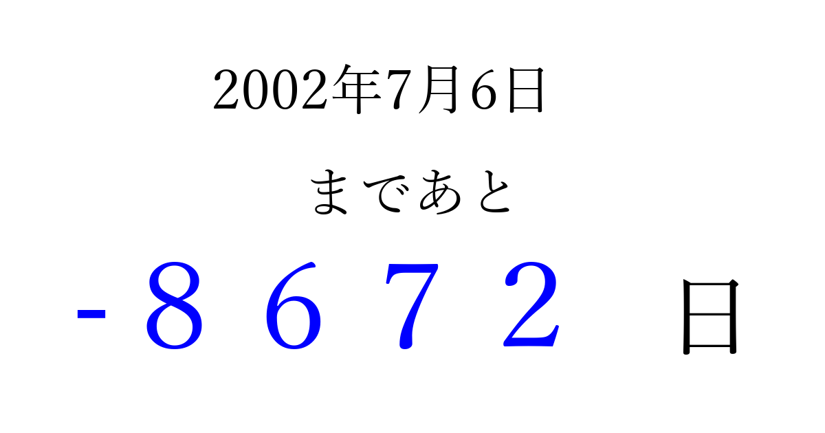 2002年7月6日(土)は もう 0000 日過ぎました 追加すると、トップページからすぐ選べるようになります ※2026/04/03現在の結果です。 最新の状態に更新する ↓シェアして、タイムライン上にカウントダウンを表示しよう!↓ 📤 この結果を共有する Tweet シェア Threads Bluesky 別の日付でカウントダウン 2002年7月のカレンダー このページをブックマークに追加すると、いつでもカウントダウンを確認できます。 (PC: Ctrl+D / Mac: ⌘+D) hitome-notes.comでは以下のページも運営しています。 指定日と期間から日付を計算 | ガチャ確率計算・シミュレーション | プライバシー・ポリシー 運営者:Avocado