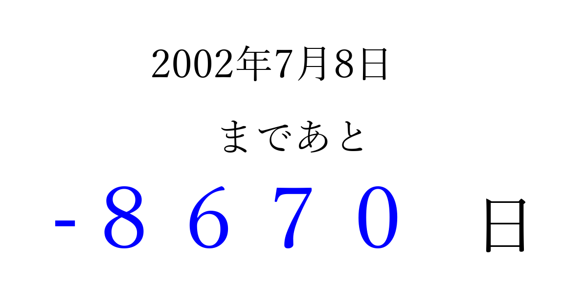 2002年7月8日(月)は もう 0000 日過ぎました 追加すると、トップページからすぐ選べるようになります ※2026/04/03現在の結果です。 最新の状態に更新する ↓シェアして、タイムライン上にカウントダウンを表示しよう!↓ 📤 この結果を共有する Tweet シェア Threads Bluesky 別の日付でカウントダウン 2002年7月のカレンダー このページをブックマークに追加すると、いつでもカウントダウンを確認できます。 (PC: Ctrl+D / Mac: ⌘+D) hitome-notes.comでは以下のページも運営しています。 指定日と期間から日付を計算 | ガチャ確率計算・シミュレーション | プライバシー・ポリシー 運営者:Avocado