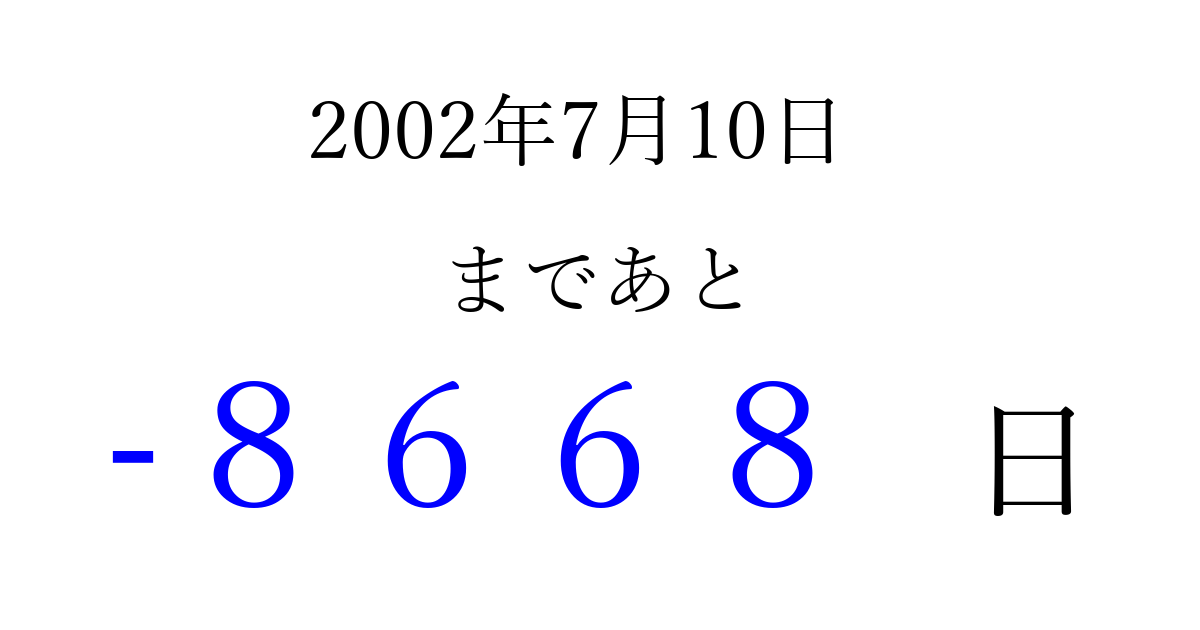 2002年7月10日(水)は もう 0000 日過ぎました 追加すると、トップページからすぐ選べるようになります ※2026/04/03現在の結果です。 最新の状態に更新する ↓シェアして、タイムライン上にカウントダウンを表示しよう!↓ 📤 この結果を共有する Tweet シェア Threads Bluesky 別の日付でカウントダウン 2002年7月のカレンダー このページをブックマークに追加すると、いつでもカウントダウンを確認できます。 (PC: Ctrl+D / Mac: ⌘+D) hitome-notes.comでは以下のページも運営しています。 指定日と期間から日付を計算 | ガチャ確率計算・シミュレーション | プライバシー・ポリシー 運営者:Avocado