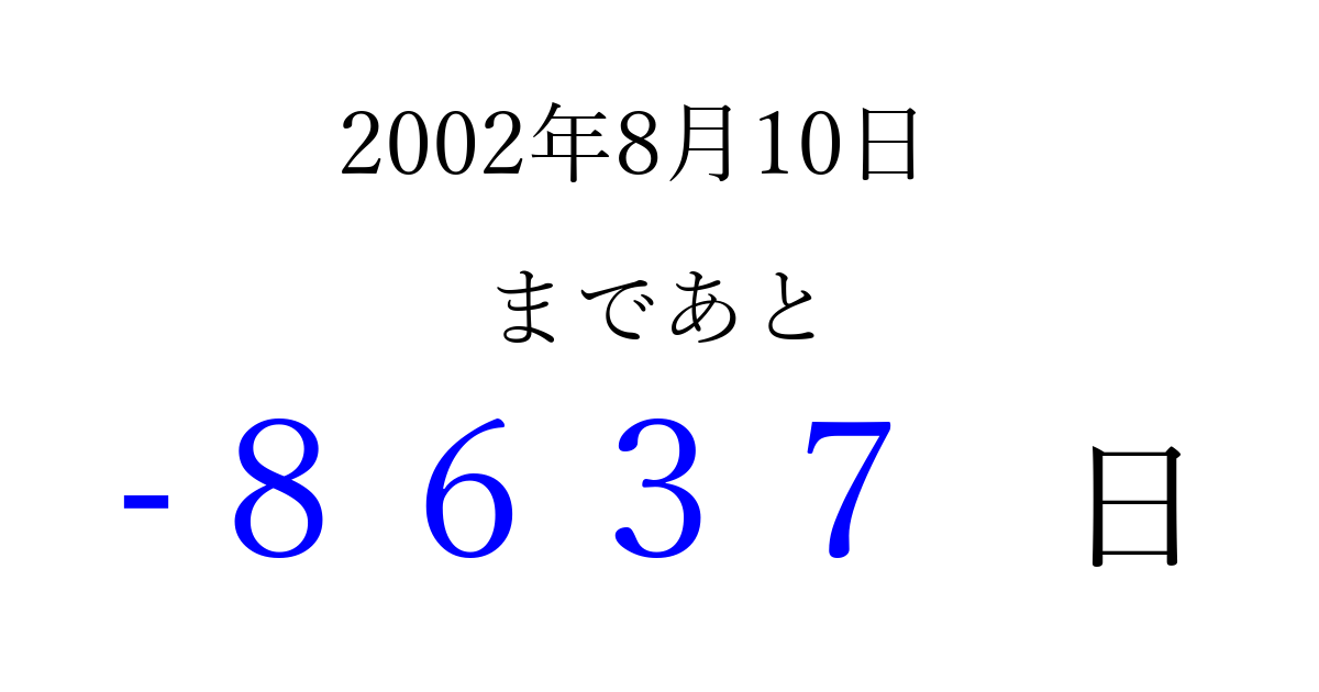 2002年8月10日(土)は もう 0000 日過ぎました 追加すると、トップページからすぐ選べるようになります ※2026/04/03現在の結果です。 最新の状態に更新する ↓シェアして、タイムライン上にカウントダウンを表示しよう!↓ 📤 この結果を共有する Tweet シェア Threads Bluesky 別の日付でカウントダウン 2002年8月のカレンダー このページをブックマークに追加すると、いつでもカウントダウンを確認できます。 (PC: Ctrl+D / Mac: ⌘+D) hitome-notes.comでは以下のページも運営しています。 指定日と期間から日付を計算 | ガチャ確率計算・シミュレーション | プライバシー・ポリシー 運営者:Avocado