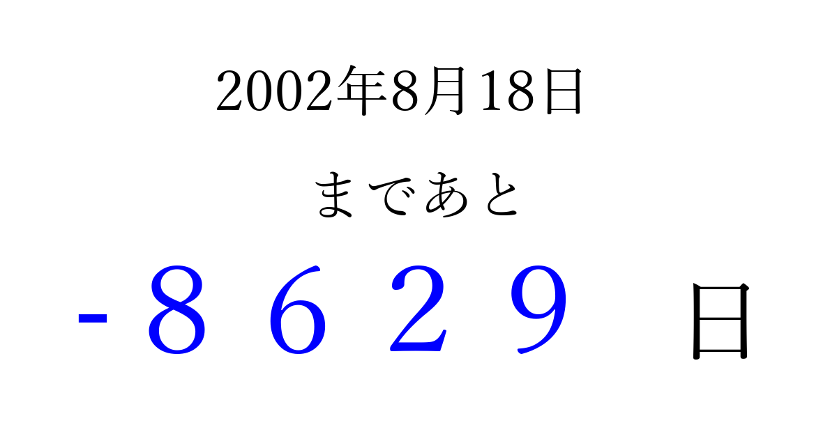 2002年8月18日(日)は もう 0000 日過ぎました 追加すると、トップページからすぐ選べるようになります ※2026/04/03現在の結果です。 最新の状態に更新する ↓シェアして、タイムライン上にカウントダウンを表示しよう!↓ 📤 この結果を共有する Tweet シェア Threads Bluesky 別の日付でカウントダウン 2002年8月のカレンダー このページをブックマークに追加すると、いつでもカウントダウンを確認できます。 (PC: Ctrl+D / Mac: ⌘+D) hitome-notes.comでは以下のページも運営しています。 指定日と期間から日付を計算 | ガチャ確率計算・シミュレーション | プライバシー・ポリシー 運営者:Avocado