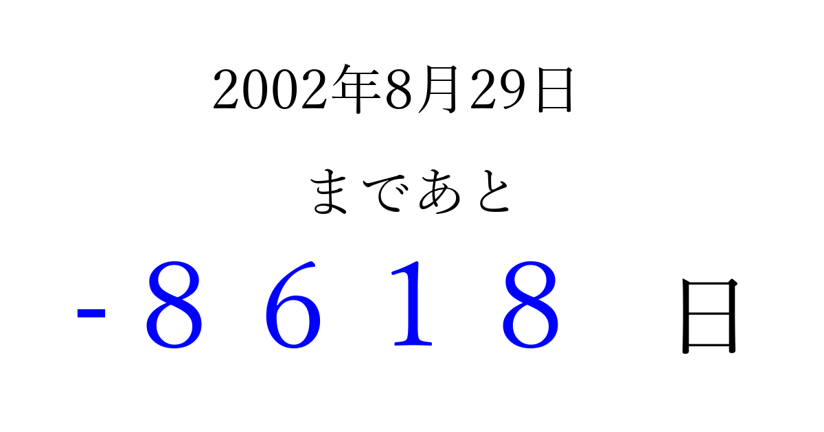 2002年8月29日(木)は もう 0000 日過ぎました 追加すると、トップページからすぐ選べるようになります ※2026/04/03現在の結果です。 最新の状態に更新する ↓シェアして、タイムライン上にカウントダウンを表示しよう!↓ 📤 この結果を共有する Tweet シェア Threads Bluesky 別の日付でカウントダウン 2002年8月のカレンダー このページをブックマークに追加すると、いつでもカウントダウンを確認できます。 (PC: Ctrl+D / Mac: ⌘+D) hitome-notes.comでは以下のページも運営しています。 指定日と期間から日付を計算 | ガチャ確率計算・シミュレーション | プライバシー・ポリシー 運営者:Avocado