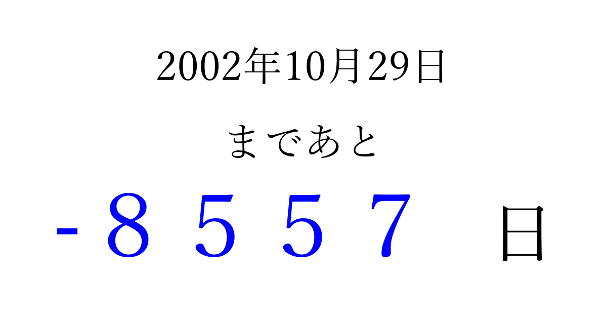2002年10月29日(火)は もう 0000 日過ぎました 追加すると、トップページからすぐ選べるようになります ※2026/04/03現在の結果です。 最新の状態に更新する ↓シェアして、タイムライン上にカウントダウンを表示しよう!↓ 📤 この結果を共有する Tweet シェア Threads Bluesky 別の日付でカウントダウン 2002年10月のカレンダー このページをブックマークに追加すると、いつでもカウントダウンを確認できます。 (PC: Ctrl+D / Mac: ⌘+D) hitome-notes.comでは以下のページも運営しています。 指定日と期間から日付を計算 | ガチャ確率計算・シミュレーション | プライバシー・ポリシー 運営者:Avocado