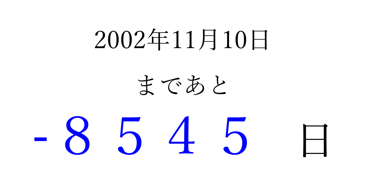 2002年11月10日(日)は もう 0000 日過ぎました 追加すると、トップページからすぐ選べるようになります ※2026/04/03現在の結果です。 最新の状態に更新する ↓シェアして、タイムライン上にカウントダウンを表示しよう!↓ 📤 この結果を共有する Tweet シェア Threads Bluesky 別の日付でカウントダウン 2002年11月のカレンダー このページをブックマークに追加すると、いつでもカウントダウンを確認できます。 (PC: Ctrl+D / Mac: ⌘+D) hitome-notes.comでは以下のページも運営しています。 指定日と期間から日付を計算 | ガチャ確率計算・シミュレーション | プライバシー・ポリシー 運営者:Avocado