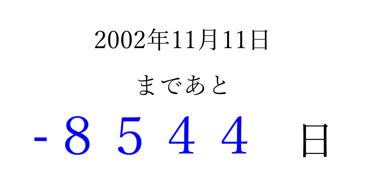 2002年11月11日(月)は もう 0000 日過ぎました 追加すると、トップページからすぐ選べるようになります ※2026/04/03現在の結果です。 最新の状態に更新する ↓シェアして、タイムライン上にカウントダウンを表示しよう!↓ 📤 この結果を共有する Tweet シェア Threads Bluesky 別の日付でカウントダウン 2002年11月のカレンダー このページをブックマークに追加すると、いつでもカウントダウンを確認できます。 (PC: Ctrl+D / Mac: ⌘+D) hitome-notes.comでは以下のページも運営しています。 指定日と期間から日付を計算 | ガチャ確率計算・シミュレーション | プライバシー・ポリシー 運営者:Avocado