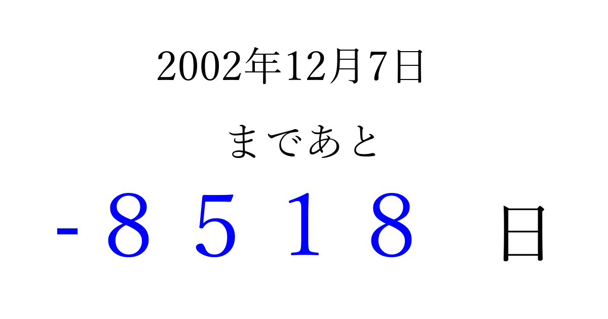 2002年12月7日(土)は もう 0000 日過ぎました 追加すると、トップページからすぐ選べるようになります ※2026/04/03現在の結果です。 最新の状態に更新する ↓シェアして、タイムライン上にカウントダウンを表示しよう!↓ 📤 この結果を共有する Tweet シェア Threads Bluesky 別の日付でカウントダウン 2002年12月のカレンダー このページをブックマークに追加すると、いつでもカウントダウンを確認できます。 (PC: Ctrl+D / Mac: ⌘+D) hitome-notes.comでは以下のページも運営しています。 指定日と期間から日付を計算 | ガチャ確率計算・シミュレーション | プライバシー・ポリシー 運営者:Avocado