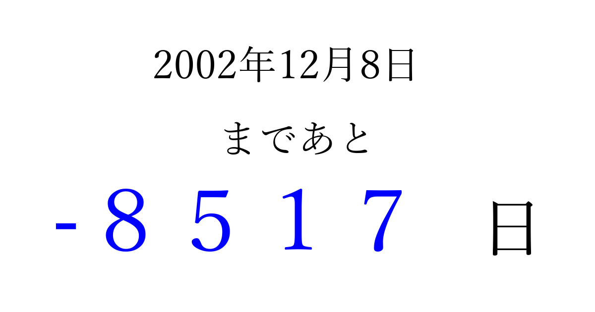 2002年12月8日(日)は もう 0000 日過ぎました 追加すると、トップページからすぐ選べるようになります ※2026/04/03現在の結果です。 最新の状態に更新する ↓シェアして、タイムライン上にカウントダウンを表示しよう!↓ 📤 この結果を共有する Tweet シェア Threads Bluesky 別の日付でカウントダウン 2002年12月のカレンダー このページをブックマークに追加すると、いつでもカウントダウンを確認できます。 (PC: Ctrl+D / Mac: ⌘+D) hitome-notes.comでは以下のページも運営しています。 指定日と期間から日付を計算 | ガチャ確率計算・シミュレーション | プライバシー・ポリシー 運営者:Avocado