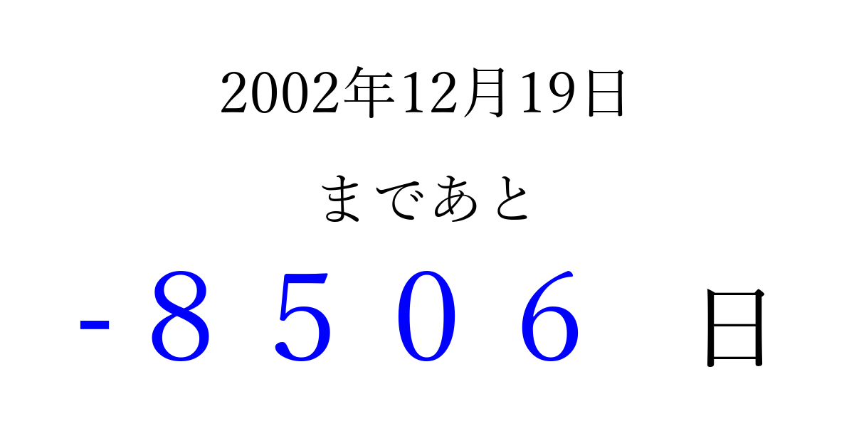 2002年12月19日(木)は もう 0000 日過ぎました 追加すると、トップページからすぐ選べるようになります ※2026/04/03現在の結果です。 最新の状態に更新する ↓シェアして、タイムライン上にカウントダウンを表示しよう!↓ 📤 この結果を共有する Tweet シェア Threads Bluesky 別の日付でカウントダウン 2002年12月のカレンダー このページをブックマークに追加すると、いつでもカウントダウンを確認できます。 (PC: Ctrl+D / Mac: ⌘+D) hitome-notes.comでは以下のページも運営しています。 指定日と期間から日付を計算 | ガチャ確率計算・シミュレーション | プライバシー・ポリシー 運営者:Avocado