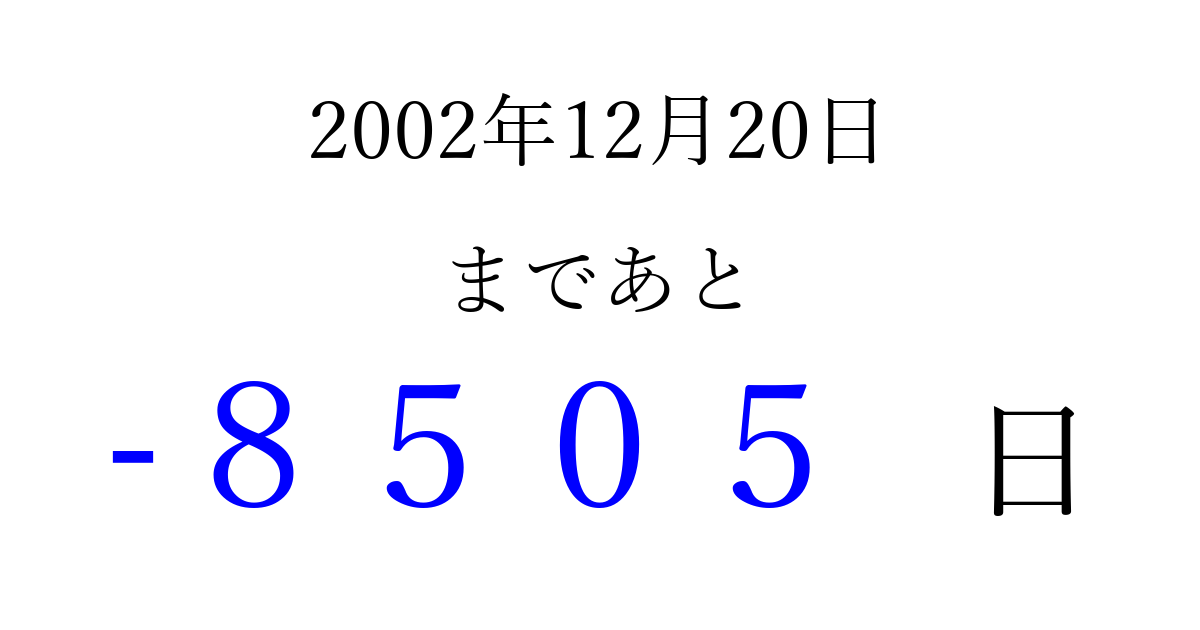 2002年12月20日(金)は もう 0000 日過ぎました 追加すると、トップページからすぐ選べるようになります ※2026/04/03現在の結果です。 最新の状態に更新する ↓シェアして、タイムライン上にカウントダウンを表示しよう!↓ 📤 この結果を共有する Tweet シェア Threads Bluesky 別の日付でカウントダウン 2002年12月のカレンダー このページをブックマークに追加すると、いつでもカウントダウンを確認できます。 (PC: Ctrl+D / Mac: ⌘+D) hitome-notes.comでは以下のページも運営しています。 指定日と期間から日付を計算 | ガチャ確率計算・シミュレーション | プライバシー・ポリシー 運営者:Avocado