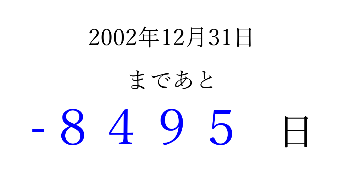 2002年12月31日(火)は もう 0000 日過ぎました 追加すると、トップページからすぐ選べるようになります ※2026/04/04現在の結果です。 最新の状態に更新する ↓シェアして、タイムライン上にカウントダウンを表示しよう!↓ 📤 この結果を共有する Tweet シェア Threads Bluesky 別の日付でカウントダウン 2002年12月のカレンダー このページをブックマークに追加すると、いつでもカウントダウンを確認できます。 (PC: Ctrl+D / Mac: ⌘+D) hitome-notes.comでは以下のページも運営しています。 指定日と期間から日付を計算 | ガチャ確率計算・シミュレーション | プライバシー・ポリシー 運営者:Avocado
