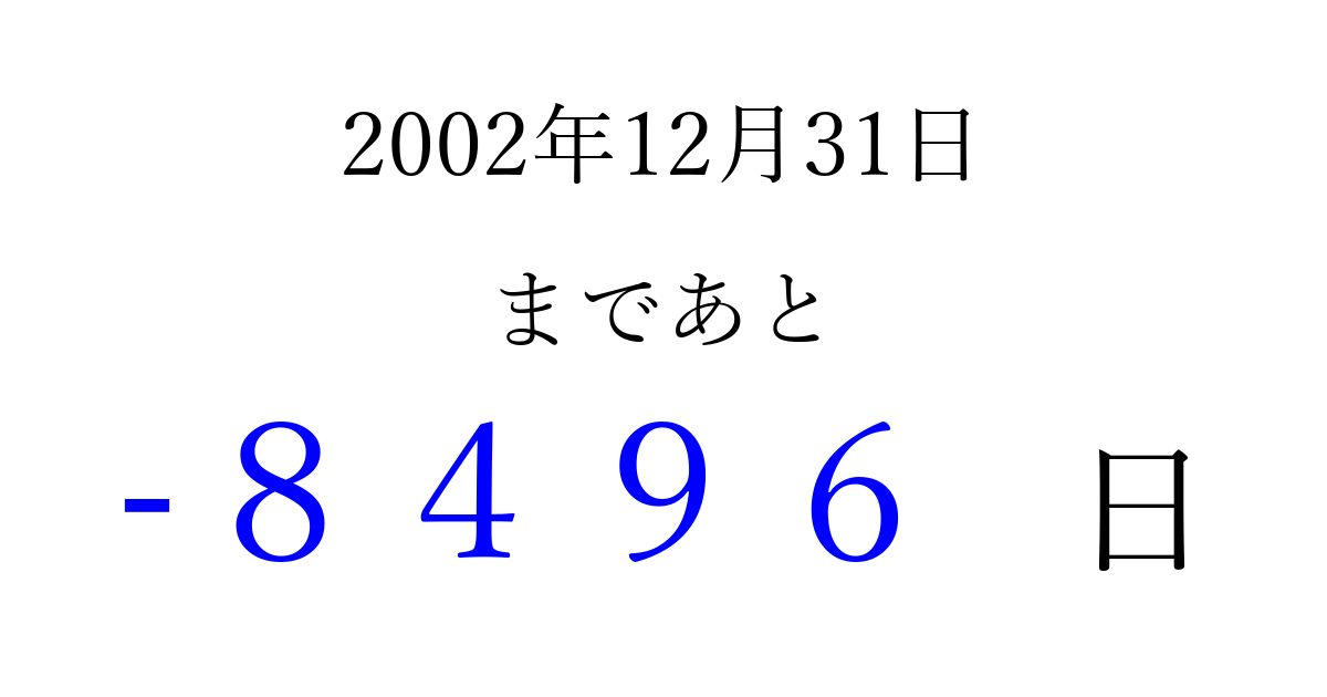 2002年12月31日(火)は もう 0000 日過ぎました 追加すると、トップページからすぐ選べるようになります ※2026/04/05現在の結果です。 最新の状態に更新する ↓シェアして、タイムライン上にカウントダウンを表示しよう!↓ 📤 この結果を共有する Tweet シェア Threads Bluesky 別の日付でカウントダウン 2002年12月のカレンダー このページをブックマークに追加すると、いつでもカウントダウンを確認できます。 (PC: Ctrl+D / Mac: ⌘+D) hitome-notes.comでは以下のページも運営しています。 指定日と期間から日付を計算 | ガチャ確率計算・シミュレーション | プライバシー・ポリシー 運営者:Avocado