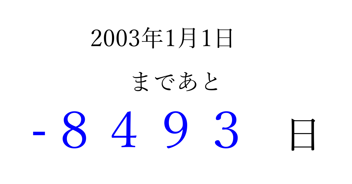 2003年1月1日(水)は もう 0000 日過ぎました 追加すると、トップページからすぐ選べるようになります ※2026/04/03現在の結果です。 最新の状態に更新する ↓シェアして、タイムライン上にカウントダウンを表示しよう!↓ 📤 この結果を共有する Tweet シェア Threads Bluesky 別の日付でカウントダウン 2003年1月のカレンダー このページをブックマークに追加すると、いつでもカウントダウンを確認できます。 (PC: Ctrl+D / Mac: ⌘+D) hitome-notes.comでは以下のページも運営しています。 指定日と期間から日付を計算 | ガチャ確率計算・シミュレーション | プライバシー・ポリシー 運営者:Avocado