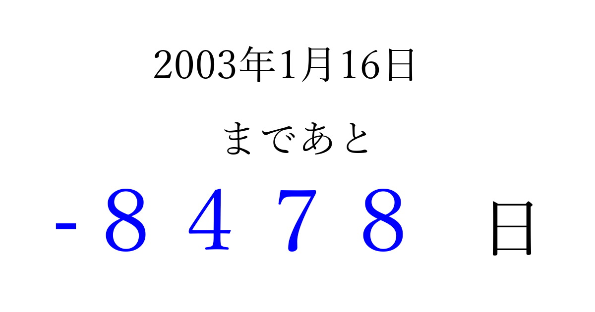 2003年1月16日(木)は もう 0000 日過ぎました 追加すると、トップページからすぐ選べるようになります ※2026/04/03現在の結果です。 最新の状態に更新する ↓シェアして、タイムライン上にカウントダウンを表示しよう!↓ 📤 この結果を共有する Tweet シェア Threads Bluesky 別の日付でカウントダウン 2003年1月のカレンダー このページをブックマークに追加すると、いつでもカウントダウンを確認できます。 (PC: Ctrl+D / Mac: ⌘+D) hitome-notes.comでは以下のページも運営しています。 指定日と期間から日付を計算 | ガチャ確率計算・シミュレーション | プライバシー・ポリシー 運営者:Avocado