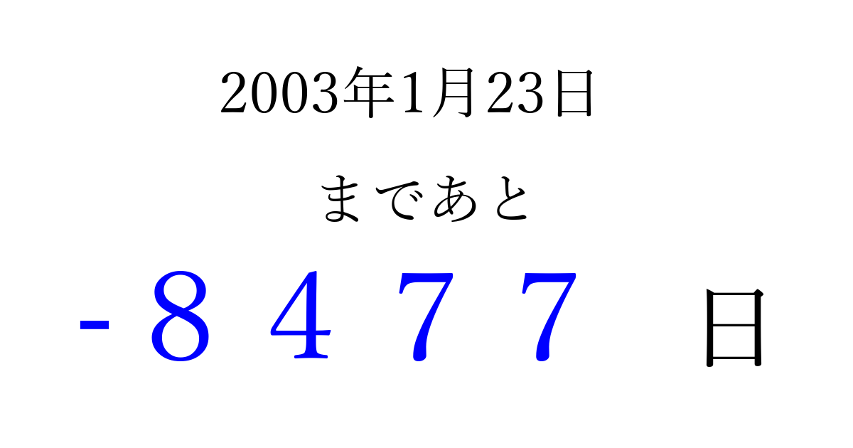 2003年1月23日(木)は もう 0000 日過ぎました 追加すると、トップページからすぐ選べるようになります ※2026/04/09現在の結果です。 最新の状態に更新する ↓シェアして、タイムライン上にカウントダウンを表示しよう!↓ 📤 この結果を共有する Tweet シェア Threads Bluesky 別の日付でカウントダウン 2003年1月のカレンダー このページをブックマークに追加すると、いつでもカウントダウンを確認できます。 (PC: Ctrl+D / Mac: ⌘+D) hitome-notes.comでは以下のページも運営しています。 指定日と期間から日付を計算 | ガチャ確率計算・シミュレーション | プライバシー・ポリシー 運営者:Avocado