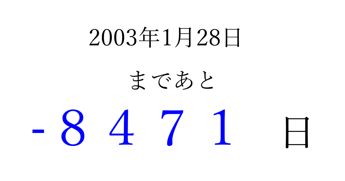 2003年1月28日(火)は もう 0000 日過ぎました 追加すると、トップページからすぐ選べるようになります ※2026/04/08現在の結果です。 最新の状態に更新する ↓シェアして、タイムライン上にカウントダウンを表示しよう!↓ 📤 この結果を共有する Tweet シェア Threads Bluesky 別の日付でカウントダウン 2003年1月のカレンダー このページをブックマークに追加すると、いつでもカウントダウンを確認できます。 (PC: Ctrl+D / Mac: ⌘+D) hitome-notes.comでは以下のページも運営しています。 指定日と期間から日付を計算 | ガチャ確率計算・シミュレーション | プライバシー・ポリシー 運営者:Avocado