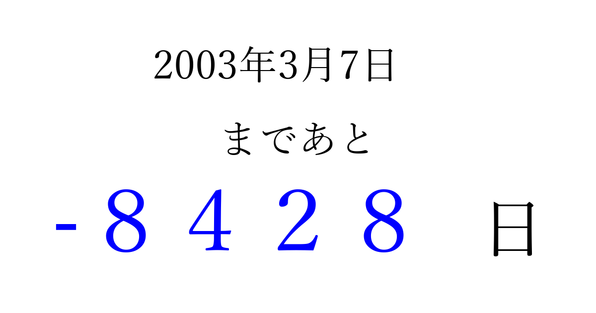 2003年3月7日(金)は もう 0000 日過ぎました 追加すると、トップページからすぐ選べるようになります ※2026/04/03現在の結果です。 最新の状態に更新する ↓シェアして、タイムライン上にカウントダウンを表示しよう!↓ 📤 この結果を共有する Tweet シェア Threads Bluesky 別の日付でカウントダウン 2003年3月のカレンダー このページをブックマークに追加すると、いつでもカウントダウンを確認できます。 (PC: Ctrl+D / Mac: ⌘+D) hitome-notes.comでは以下のページも運営しています。 指定日と期間から日付を計算 | ガチャ確率計算・シミュレーション | プライバシー・ポリシー 運営者:Avocado