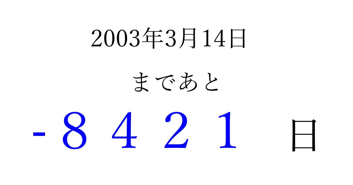 2003年3月14日(金)は もう 0000 日過ぎました 追加すると、トップページからすぐ選べるようになります ※2026/04/03現在の結果です。 最新の状態に更新する ↓シェアして、タイムライン上にカウントダウンを表示しよう!↓ 📤 この結果を共有する Tweet シェア Threads Bluesky 別の日付でカウントダウン 2003年3月のカレンダー このページをブックマークに追加すると、いつでもカウントダウンを確認できます。 (PC: Ctrl+D / Mac: ⌘+D) hitome-notes.comでは以下のページも運営しています。 指定日と期間から日付を計算 | ガチャ確率計算・シミュレーション | プライバシー・ポリシー 運営者:Avocado