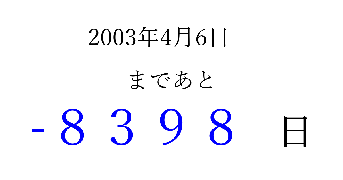 2003年4月6日(日)は もう 0000 日過ぎました 追加すると、トップページからすぐ選べるようになります ※2026/04/03現在の結果です。 最新の状態に更新する ↓シェアして、タイムライン上にカウントダウンを表示しよう!↓ 📤 この結果を共有する Tweet シェア Threads Bluesky 別の日付でカウントダウン 2003年4月のカレンダー このページをブックマークに追加すると、いつでもカウントダウンを確認できます。 (PC: Ctrl+D / Mac: ⌘+D) hitome-notes.comでは以下のページも運営しています。 指定日と期間から日付を計算 | ガチャ確率計算・シミュレーション | プライバシー・ポリシー 運営者:Avocado