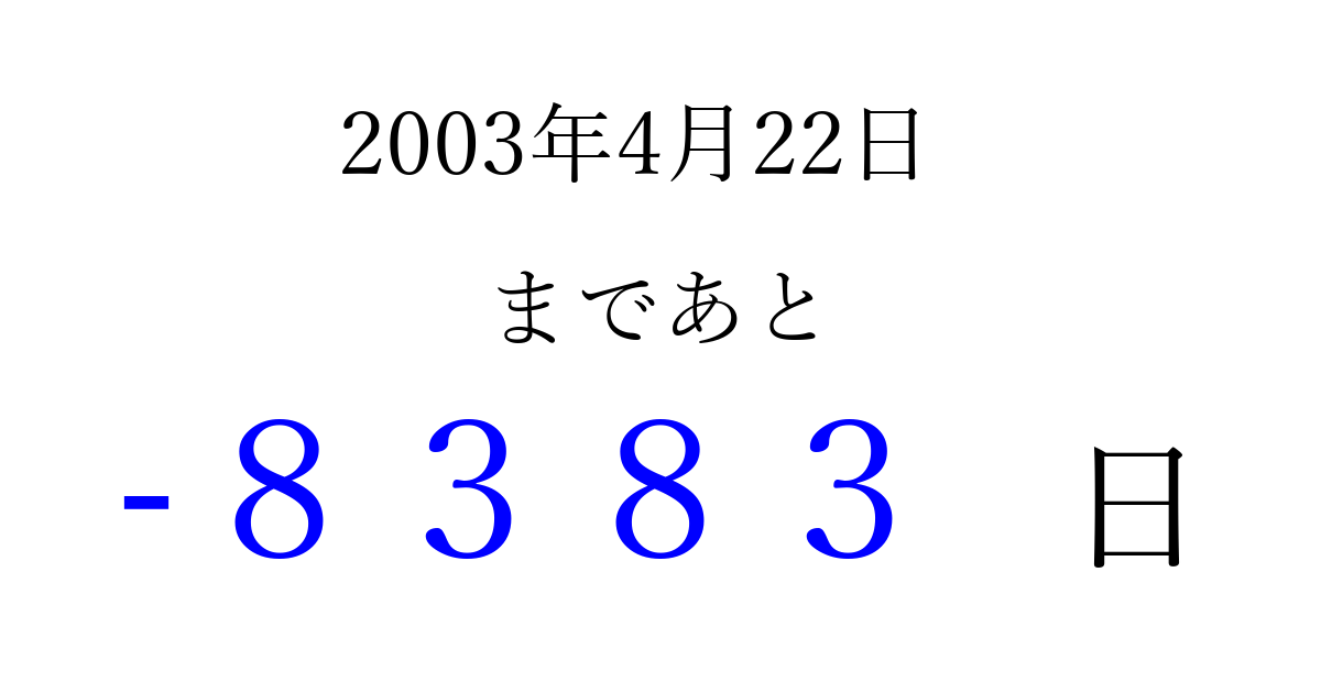2003年4月22日(火)は もう 0000 日過ぎました 追加すると、トップページからすぐ選べるようになります ※2026/04/04現在の結果です。 最新の状態に更新する ↓シェアして、タイムライン上にカウントダウンを表示しよう!↓ 📤 この結果を共有する Tweet シェア Threads Bluesky 別の日付でカウントダウン 2003年4月のカレンダー このページをブックマークに追加すると、いつでもカウントダウンを確認できます。 (PC: Ctrl+D / Mac: ⌘+D) hitome-notes.comでは以下のページも運営しています。 指定日と期間から日付を計算 | ガチャ確率計算・シミュレーション | プライバシー・ポリシー 運営者:Avocado