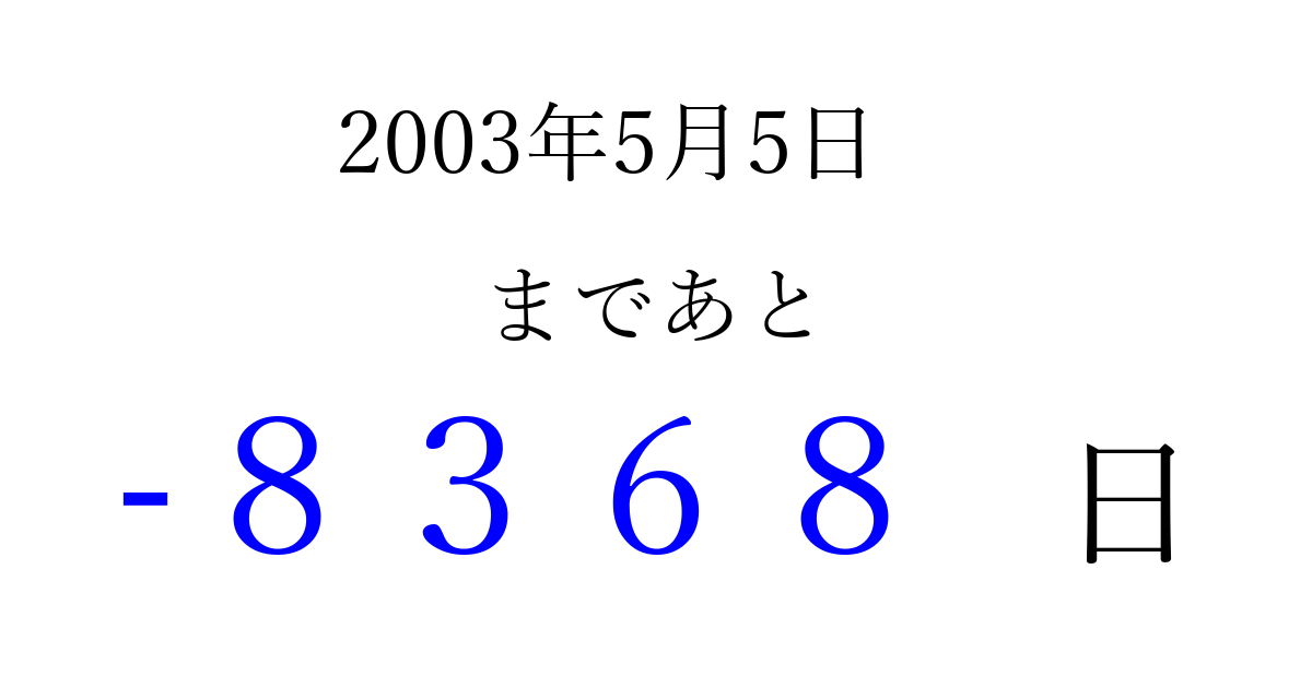 2003年5月5日(月)は もう 0000 日過ぎました 追加すると、トップページからすぐ選べるようになります ※2026/04/02現在の結果です。 最新の状態に更新する ↓シェアして、タイムライン上にカウントダウンを表示しよう!↓ 📤 この結果を共有する Tweet シェア Threads Bluesky 別の日付でカウントダウン 2003年5月のカレンダー このページをブックマークに追加すると、いつでもカウントダウンを確認できます。 (PC: Ctrl+D / Mac: ⌘+D) hitome-notes.comでは以下のページも運営しています。 指定日と期間から日付を計算 | ガチャ確率計算・シミュレーション | プライバシー・ポリシー 運営者:Avocado