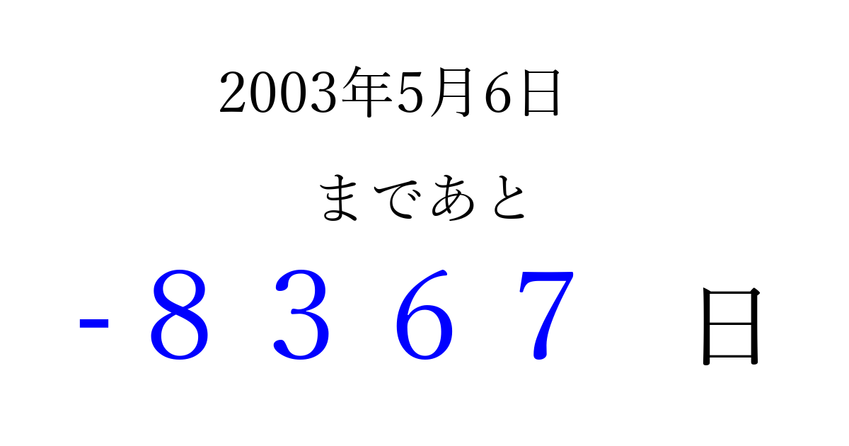 2003年5月6日(火)は もう 0000 日過ぎました 追加すると、トップページからすぐ選べるようになります ※2026/04/02現在の結果です。 最新の状態に更新する ↓シェアして、タイムライン上にカウントダウンを表示しよう!↓ 📤 この結果を共有する Tweet シェア Threads Bluesky 別の日付でカウントダウン 2003年5月のカレンダー このページをブックマークに追加すると、いつでもカウントダウンを確認できます。 (PC: Ctrl+D / Mac: ⌘+D) hitome-notes.comでは以下のページも運営しています。 指定日と期間から日付を計算 | ガチャ確率計算・シミュレーション | プライバシー・ポリシー 運営者:Avocado