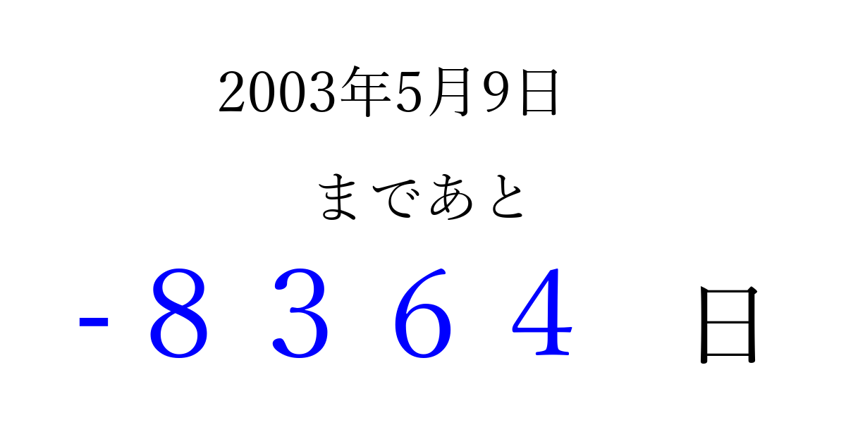 2003年5月9日(金)は もう 0000 日過ぎました 追加すると、トップページからすぐ選べるようになります ※2026/04/02現在の結果です。 最新の状態に更新する ↓シェアして、タイムライン上にカウントダウンを表示しよう!↓ 📤 この結果を共有する Tweet シェア Threads Bluesky 別の日付でカウントダウン 2003年5月のカレンダー このページをブックマークに追加すると、いつでもカウントダウンを確認できます。 (PC: Ctrl+D / Mac: ⌘+D) hitome-notes.comでは以下のページも運営しています。 指定日と期間から日付を計算 | ガチャ確率計算・シミュレーション | プライバシー・ポリシー 運営者:Avocado