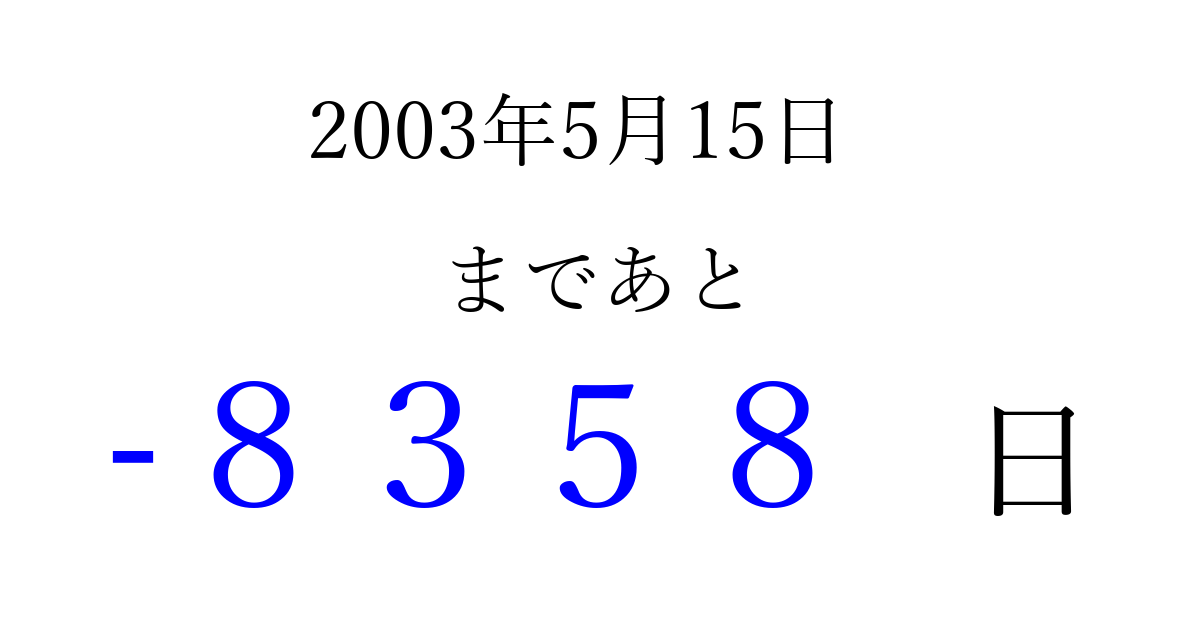 2003年5月15日(木)は もう 0000 日過ぎました 追加すると、トップページからすぐ選べるようになります ※2026/04/02現在の結果です。 最新の状態に更新する ↓シェアして、タイムライン上にカウントダウンを表示しよう!↓ 📤 この結果を共有する Tweet シェア Threads Bluesky 別の日付でカウントダウン 2003年5月のカレンダー このページをブックマークに追加すると、いつでもカウントダウンを確認できます。 (PC: Ctrl+D / Mac: ⌘+D) hitome-notes.comでは以下のページも運営しています。 指定日と期間から日付を計算 | ガチャ確率計算・シミュレーション | プライバシー・ポリシー 運営者:Avocado