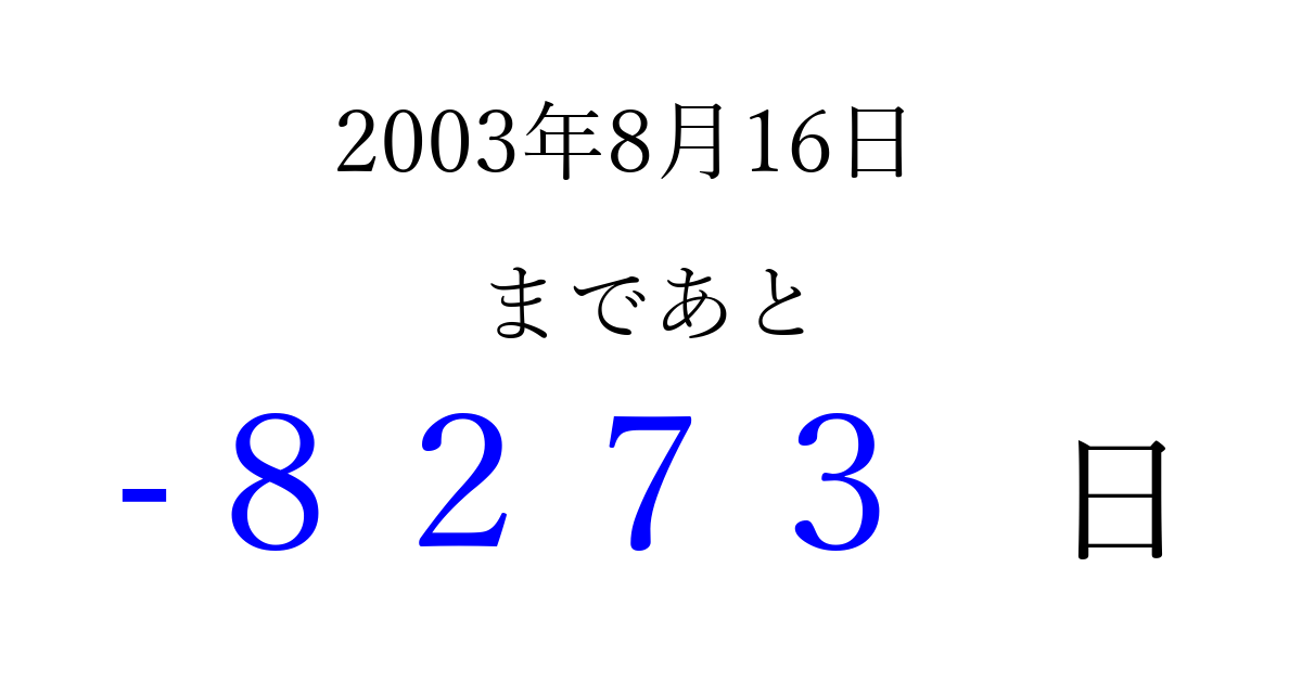 2003年8月16日(土)は もう 0000 日過ぎました 追加すると、トップページからすぐ選べるようになります ※2026/04/10現在の結果です。 最新の状態に更新する ↓シェアして、タイムライン上にカウントダウンを表示しよう!↓ 📤 この結果を共有する Tweet シェア Threads Bluesky 別の日付でカウントダウン 2003年8月のカレンダー このページをブックマークに追加すると、いつでもカウントダウンを確認できます。 (PC: Ctrl+D / Mac: ⌘+D) hitome-notes.comでは以下のページも運営しています。 指定日と期間から日付を計算 | ガチャ確率計算・シミュレーション | プライバシー・ポリシー 運営者:Avocado